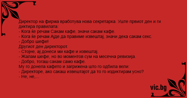 Директор на фирма вработува нова секретарка. Уште првиот ден и ги диктира правилата: