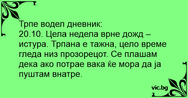 20.10. Цела недела врне дожд – истура. Трпана е тажна, цело време гледа низ прозорецот. Се плашам дека ако потрае вака ќе мора да ја пуштам внатре.