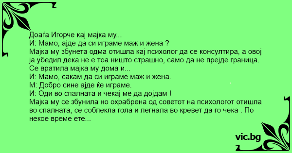 Мајка му се збунила но охрабрена од советот на психологот отишла во спалната, се соблекла гола и легнала во кревет да го чека . По некое време ете го доаѓа Игорче на врата и вика...