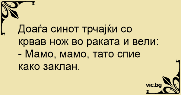 Доаѓа синот трчајќи со крвав нож во раката и вели:
