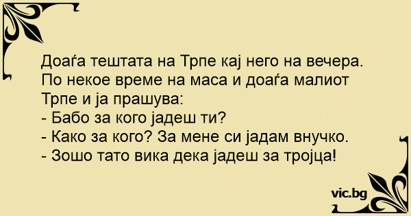 Доаѓа тештата на Трпе кај него на вечера. По некое време на маса и доаѓа малиот Трпе и ја прашува: