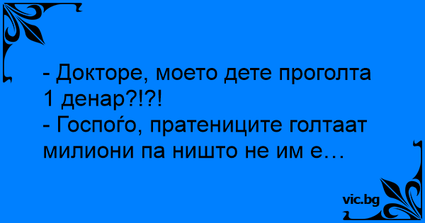 - Докторе, моето дете проголта 1 денар?!?!