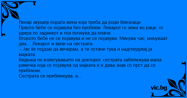 Второто бебе не се појавува и не се појавува. Минува час, минуваат два… Лекарот и вели на сестрата: