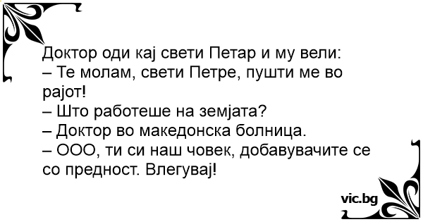 Умира доктор и се отправя към райските порти. На входа обаче го спира свети Петър и казва: