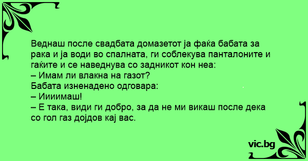 Веднаш после свадбата домазетот ја фаќа бабата за рака и ја води во спалната, ги соблекува панталоните и гаќите и се наведнува со задникот кон неа: