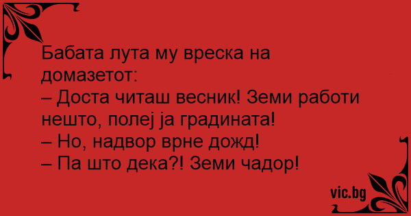 – Доста читаш весник! Земи работи нешто, полеј ја градината!