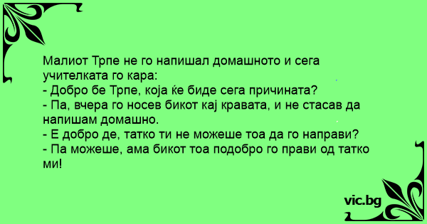 Трпе зошто не дојде вчера на школо? - Морав да ја носам кравата кај бикот. - Зарем татко ти не можеше тоа да го направи? - Па можеше, али сепак бикот подобро ќе ја заврши работата.