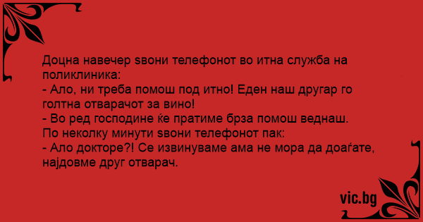 - Ало докторе?! Се извинуваме ама не мора да доаѓате, најдовме друг отварач.