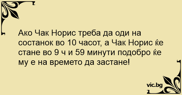 Ако Чак Норис треба да оди на состанок во 10 часот, а Чак Норис ќе стане во 9 ч и 59 минути подобро ќе му е на времето да застане!