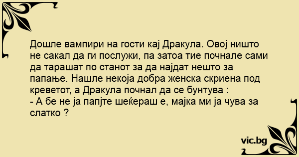 Дошле вампири на гости кај Дракула. Овој ништо не сакал да ги послужи, па затоа тие почнале сами да тарашат по станот за да најдат нешто за папање. Нашле некоја добра женска скриена под креветот, а Дракула почнал да се бунтува :