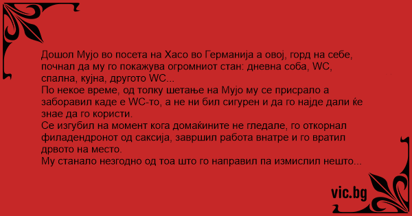Дошол Мујо во посета на Хасо во Германија а овој, горд на себе, почнал да му го покажува огромниот стан: дневна соба, WC, спална, кујна, другото WС...