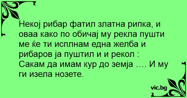 Некој рибар фатил златна рипка, и оваа како по обичај му рекла пушти ме ќе ти исплнам една желба и рибаров ја пуштил и и рекол :
