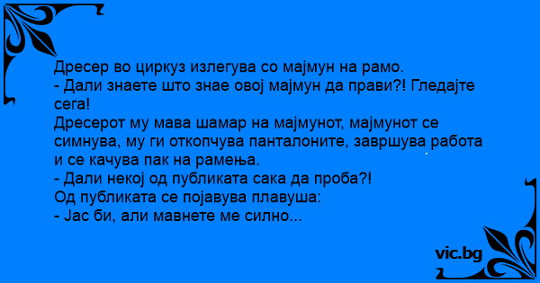 Дресерот му мава шамар на мајмунот, мајмунот се симнува, му ги откопчува панталоните, завршува работа и се качува пак на рамења.