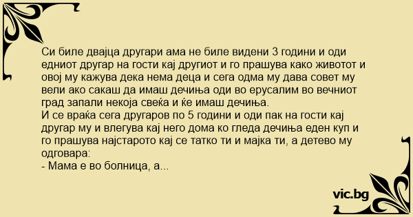 И се враќа сега другаров по 5 години и оди пак на гости кај другар му и влегува кај него дома ко гледа дечиња еден куп и го прашува најстарото кај се татко ти и мајка ти, а детево му одговара: