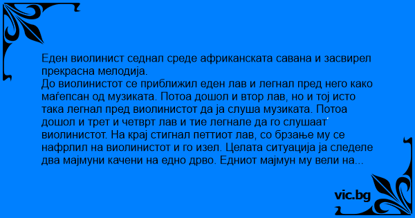 До виолинистот се приближил еден лав и легнал пред него како маѓепсан од музиката. Потоа дошол и втор лав, но и тој исто така легнал пред виолинистот да ја слуша музиката. Потоа дошол и трет и четврт лав и тие легнале да го слушаат виолинистот. На крај стигнал петтиот лав, со брзање му се нафрлил на виолинистот и го изел. Целата ситуација ја следеле два мајмуни качени на едно дрво. Едниот мајмун му вели на другиот: