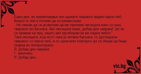 Така лисицата, која исто така ја читала басната, го здогледала гавранот со парче леб, и се одлучила повторно да се обиде да биде главна во литературата.