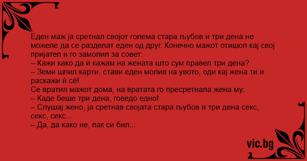 – Слушај жено, ја сретнав својата стара љубов и три дена cekc, cekc, cekc...
