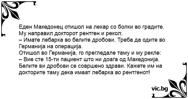 Еден Македонец отишол на лекар со болки во градите. Му направил докторот рентген и рекол: