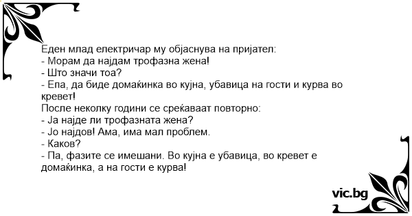 - Па, фазите се имешани. Во кујна е убавица, во кревет е домаќинка, а на гости е kуpba!