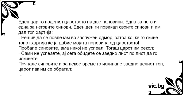 Еден цар го поделил царството на две половини. Една за него и една за неговите синови. Еден ден ги повикал своите синови и им дал топ хартија: