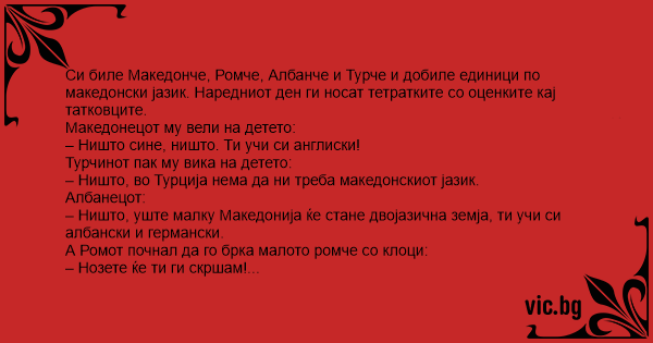 Си биле Македонче, Ромче, Албанче и Турче и добиле единици по македонски јазик. Наредниот ден ги носат тетратките со оценките кај татковците.