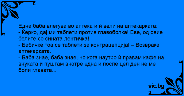- Бабичке тоа се таблети за контрацепција! – Возвраќа аптекарката.