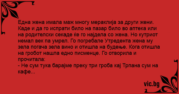Една жена имала маж многу мераклија за други жени. Каде и да го испрати било на пазар било во аптека или на родителски секаде ќе го најдела со жена. Но кутриот немал век па умрел. Го погребале Утредента жена му зела погача зела вино и отишла на будење. Кога отишла на гробот нашла едно писменце. Го отворила и прочитала: