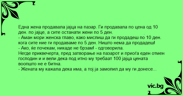 Една жена продавала јајца на пазар. Ги продавала по цена од 10 ден. по јајце, а сите останати жени по 5 ден.