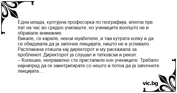 – Колешке, неправилно сте пристапиле кон учениците. Требало најнапред да ги заинтригирате со нешто и потоа да ја започнете лекцијата. Дојдете, јас ќе ви покажам.