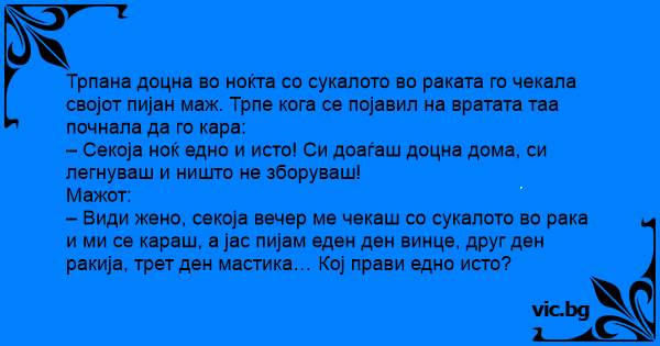 – Види жено, секоја вечер ме чекаш со сукалото во рака и ми се караш, а јас пијам еден ден винце, друг ден ракија, трет ден мастика… Кој прави едно исто?