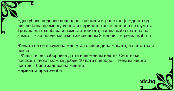 Едно убаво неделно попладне, три жени играле голф. Едната од нив не била премногу вешта и нејзиното топче летнало во шумата. Тргнала да го побара и наместо топчето, нашла жаба фатена во замка. – Ослободи ме и ќе ти исполнам 3 желби – и рекла жабата.