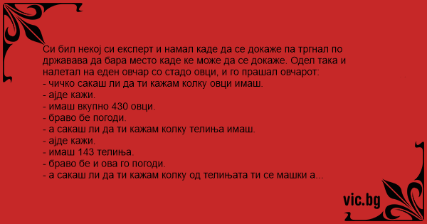 Си бил некој си експерт и намал каде да се докаже па тргнал по државава да бара место каде ке може да се докаже. Одел така и налетал на еден овчар со стадо овци, и го прашал овчарот:
