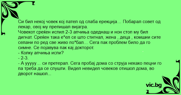 Си бил некој човек кој пател од слаба ерекција… Побарал совет од лекар, овој му препишал вијагра.