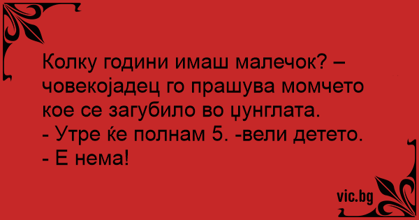 Колку години имаш малечок? – човекојадец го прашува момчето кое се загубило во џунглата.