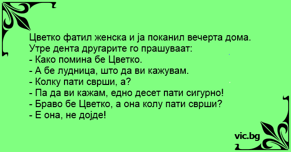 - Браво бе Цветко, а она колу пати сврши?