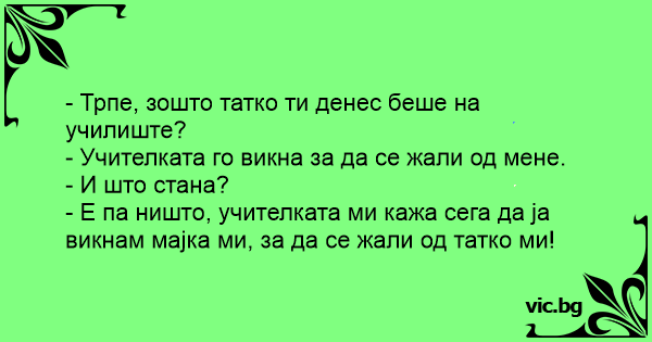 - Е па ништо, учителката ми кажа сега да ја викнам мајка ми, за да се жали од татко ми!