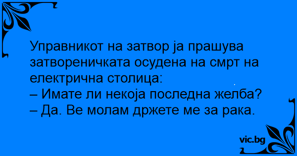 Un oltean e condamnat la moarte prin electrocutare. Este asezat pe scaunul electric si intrebat care e ultima lui dorinta. Olteanul raspunde: - Sa ma tineti de mina.
