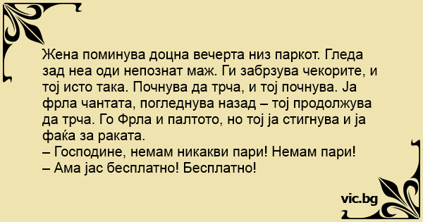 Жена поминува доцна вечерта низ паркот. Гледа зад неа оди непознат маж. Ги забрзува чекорите, и тој исто така. Почнува да трча, и тој почнува. Ја фрла чантата, погледнува назад – тој продолжува да трча. Го Фрла и палтото, но тој ја стигнува и ја фаќа за раката.