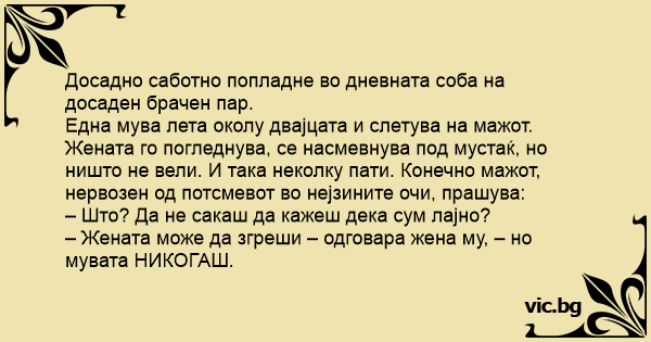 – Жената може да згреши – одговара жена му, – но мувата НИКОГАШ.