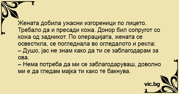 Требало да и пресади кожа. Донор бил сопругот со кожа од задникот. По операцијата, жената се освестила, се погледнала во огледалото и рекла: