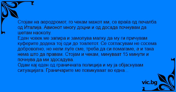 Стојам на аеродромот, го чекам мажот ми, се враќа од печалба од Италија. Авионот многу доцни и од досада почнувам да шетам наоколу.