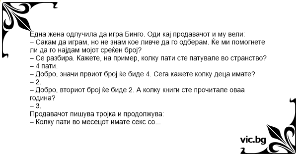 Една жена одлучила да игра Бинго. Оди кај продавачот и му вели: