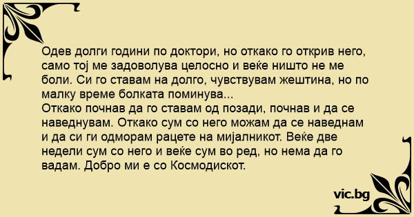 Откако почнав да го ставам од позади, почнав и да се наведнувам. Откако сум со него можам да се наведнам и да си ги одморам рацете на мијалникот. Веќе две недели сум со него и веќе сум во ред, но нема да го вадам. Добро ми е со Космодискот.