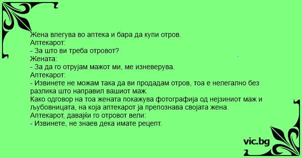 Рецепт La mujer en busca de Arsénico Arsen aus der Apotheke Ο Φαρμακοποιός Δηλητήριο Влиза мъж в аптека. Жена в аптеката Ein Mann möchte seine Frau umbringen. Er geht zur Apotheke und verlangt Zyankali. Der Apotheker mustert ihn streng und meint: Le pharmacien au client: Аптекаря: Жена разбрала за изневярата на мъжа си и решава да го отрови с хапчета. Влиза въпросната дама при доктора и казва: A nice, calm and respectable lady went into the pharmacy, right up to the pharmacist, looked straight into his eyes, and said, "I would like to buy some cyanide." - Скажите, у вас есть мышьяк? Una donna entra in farmacia e chiede: A woman walks into a pharmacy Une femme se rend dans une pharmacie et demande de l'arsenic. Le pharmacien lui demande : Kommt ein Mann in die Apotheke und verlangt 50 Gramm Arsen. Fragt der Verkäufer: "Haben Sie dafür ein Rezept?" "Nein, aber ein Bild von meiner Schwiegermutter..." A man who wants to murder his wife goes in a pharmacy and asks for cyanide. "I'm sorry sir, but I can't give you cyanide just like that." Without a word, the man takes out his wife's photograph and holds it in front of him. The pharmacist apologizes, "My mistake, I didn't realize you had a... Kommt ein Mann in die Apotheke und sagt: „Bitte geben sie mir eine Packung Strychnin.“ Apotheker: „Wofür brauchen Sie das?“ Mann: „Ich will meine Frau ermorden.“ Apotheker: „Das können Sie doch nicht machen.“ Der Mann zieht ein Foto seiner Frau aus der Tasche und zeigt es dem Apotheker.... Przychodzi baba do apteki i mówi do aptekarza, że chce kupić arszenik. - Po co pani arszenik? - pyta aptekarz. - Chcę otruć mojego męża, który mnie zdradza. - Droga pani, nie mogę pani sprzedać arszeniku, aby pani zabiła męża, nawet w przypadku gdy sypia z inną kobietą. Na to kobieta wyciąga... Een dame wandelt de apotheek binnen en vraagt er wat arsenicum. "Waarvoor hebt u dat nodig, mevrouw?". "Om mijn man te vermoorden..." "Daarvoor mag ik u dat niet verkopen.". De dame haalt uit haar... Kadının biri, eczaneye dalar ve bir şişe arsenik ister. Eczacı, kadına arsenikle ne yapacağını sorar. Kadın: -Kocamı öldüreceğim! diye cevap verir. Eczacı: -Kusura bakmayın ama size bu sebeple... Uma mulher entra em uma farmácia e pede ao farmacêutico: - Por favor, gostaria de comprar um vidro de morfina. - Mas, minh asenhora, eu não posso verder este produto assim... Mas pra que é que você... Ein Mann, der seine Frau umbringen will, geht in die Apotheke und verlangt Zyankali. Der Apotheker: "Tut mir leid, ich kann ihnen das nicht einfach so rausgeben." Der Mann holt ein Bild von seiner... Uma mulher entra na farmácia e pede ao atendente que lhe traga 10g de cianureto. O rapaz, curioso, pergunta para quê ela precisa dessa substância tão letal. Ao que ela responde com a maior calma do... Una dama entra a una farmacia y le pide al farmacéutico: - Por favor, quisiera comprar arsénico. Dado que el arsénico es muy tóxico y letal, el farmacéutico quiso saber más datos antes de... Manden på apoteket: - Jeg vil gerne have lidt arsenik til min svigermor. - Har de recept? - Nej, men jeg har et billede Una señora entra en una farmacia y le pide al farmacéutico un frasco de arsénico. El doctor dice: - ¡Señora! ¿para qué quiere el arsénico? - Para matar a mi marido, -responde tranquila la señora. -... Una donna va in farmacia: "mi può dare il veleno più potente che ha" ed il farmacista: "a cosa le serve?" e la donna: "a uccidere mio marito" il farmacista: "non posso" e la donna caccia una foto... Ei käy, apteekkari sanoi asiakkaalle. - Arsenikin ostoon pitää olla lupa. Pelkkä anopin kuva ei käy. Apotekeren siger til kunden: - Nej da! Jeg kan ikke bare give dig Arsenik, bare sådan! Jeg skal have en recept, før jeg udleverer det! - Okaj, okaj! Hvad nu hvis jeg viser dig et billede af min... Egy nő bemegy a gyógyszertárba. - Patikus úr! Olyan mérget szeretnék venni, amivel gyorsan megölhetem a férjemet. - Hogy képzeli asszonyom, én ilyet nem adhatok önnek! Erre az asszony elővesz egy... A nő bemegy a patikába és mérget kér. A patikus meglepődik: - Asszonyom, miért van szüksége méregre? - Megölöm a férjemet. - Nagyon sajnálom, de nem adhatok el önnek mérget azért, hogy megöljön... En kvinna kom in på apoteket och ville köpa arsenik. Apotekaren undrade vad hon skulle ha det till. Jo, hon skulle ta livet av sin man... - Men jag kan ju inte sälja arsenik till dig när du ska ta... En una pequeña farmacia del pueblo entra una señora y dice: - Por favor, quiero comprar arsénico! - No puedo venderle eso. ¿Cuál es su finalidad? - ¡Matar a mi marido! - Mucho peor, para ese fin no... Een man komt bij de apotheker en hij vraagt wat arsenicum voor zijn schoonmoeder. "heeft u een voorschrift?" zegt de apotheker? "nee, maar wel een foto!" A patikus így szól a pult előtt álló izgatott férfihez: - Sajnálom, uram! Ahhoz, hogy arzént vegyen, recept is kell, nem elég az anyósa fényképe. En kvinna kom in på apoteket och ville köpa arsenik. - Vad ska ni ha det till frågade apotekaren? - Jag ska ta livet av min man!!! Apotekaren: - Jag kan inte sälja arsenik för att ni ska döda eran... Nainen käveli apteekkiin ja pyysi miesapteekkarilta syanidia ja nopeasti. Myyjä luonnollisesti huolestui moisesta pyynnöstä ja kysyi: - ”Miksi ihmeessä te tarvitsette syanidia?” Nainen selitti,... Aptiekā. - Cienījamais, lai iegādātos indi, nepieciešama recepte! - Ar sievas mātes fotogrāfiju nepietiks?! A lady walks into a drug store and tells the pharmacist she needs some cyanide. Then the lady reached into her purse and pulled out a picture of her husband in bed with the pharmacist’s wife. The... Egy asszony bemegy a patikába, és ciánt kér. Kérdezi 