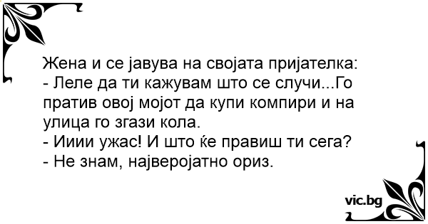 - Леле да ти кажувам што се случи...Го пратив овој мојот да купи компири и на улица го згази кола.