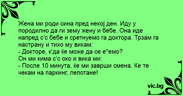Жена ми роди сина пред некој ден. Иду у породилно да ги зему жену и бебе. Она иде напред с’с бебе и сретнуемо га доктора. Трзам га настрану и тихо му викам: