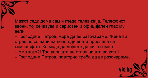 – Господине Петров, мора да ве разочараме. Жена ви страшно се напи на новогодишната прослава на компанијата. Ќе мода да дојдете да си ја земете.