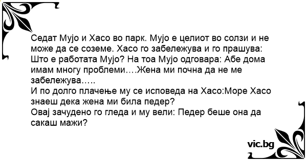 Што е работата Мујо? На тоа Мујо одговара: Абе дома имам многу проблеми….Жена ми почна да не ме забележува…..