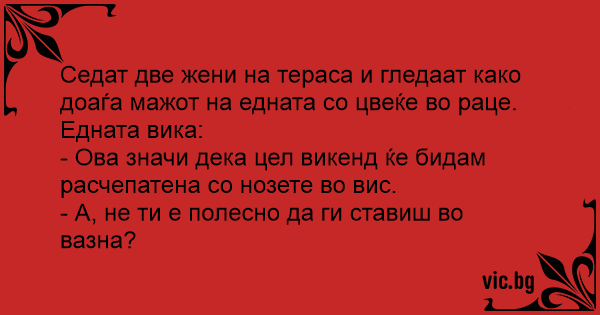 To damer sitter og prater en fredag ettermiddag. En av dem titter opp og ser ektemannen komme gående med blomster i hånden. Hun himler med øynene og sier, "Der kommer den dusten med blomster. Nå...