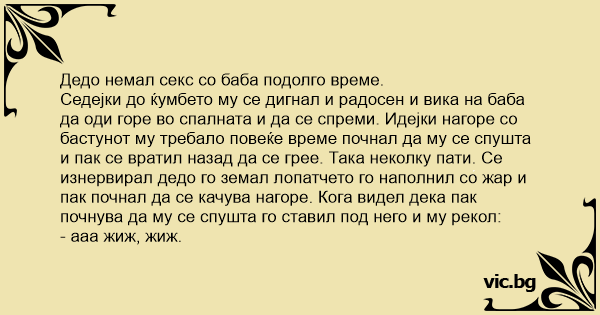 Седејки до ќумбето му се дигнал и радосен и вика на баба да оди горе во спалната и да се спреми. Идејки нагоре со бастунот му требало повеќе време почнал да му се спушта и пак се вратил назад да се грее. Така неколку пати. Се изнервирал дедо го земал лопатчето го наполнил со жар и пак почнал да се качува нагоре. Кога видел дека пак почнува да му се спушта го ставил под него и му рекол: